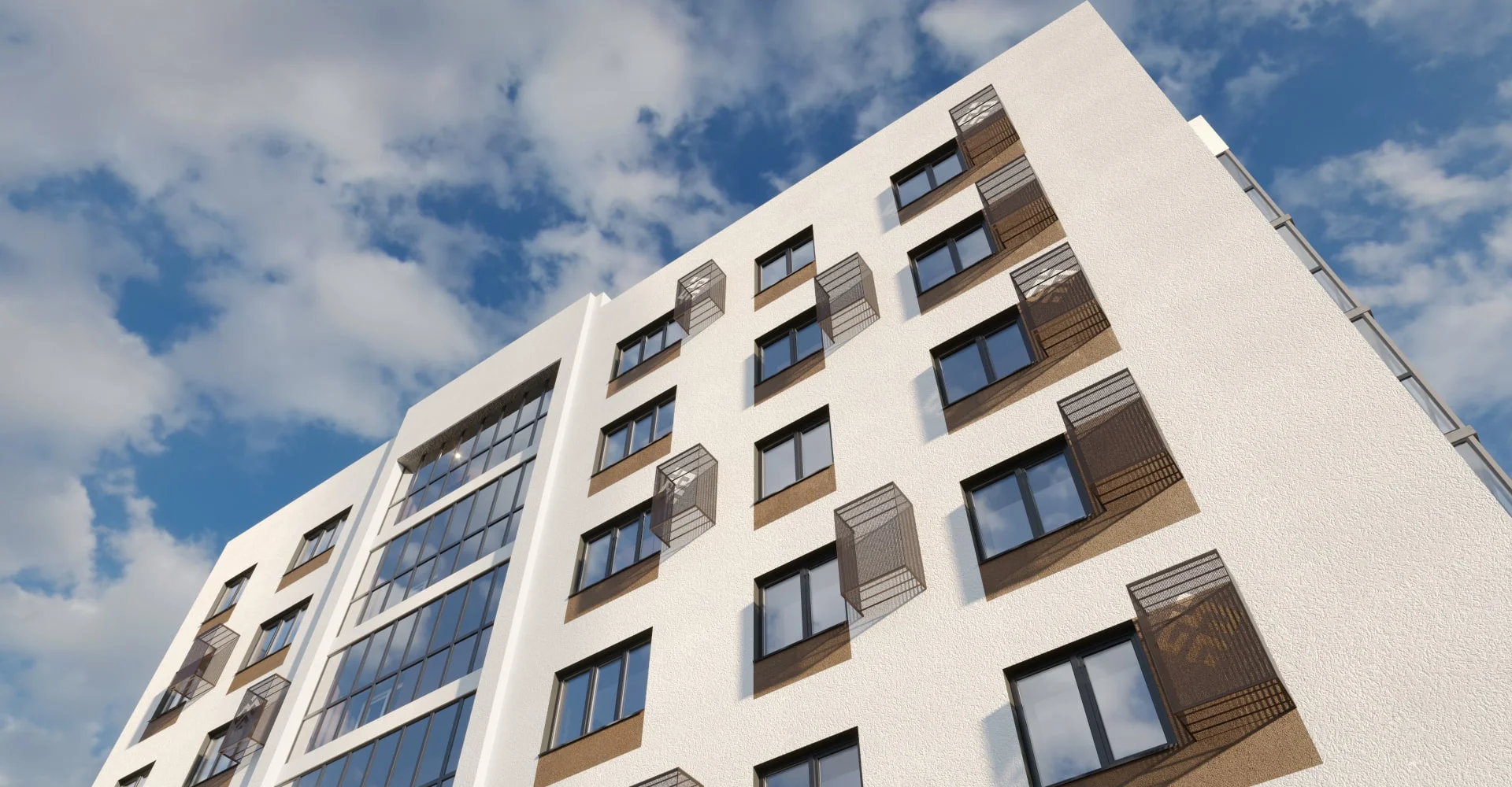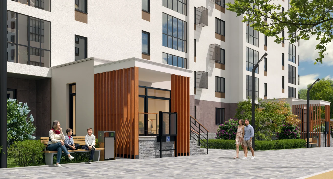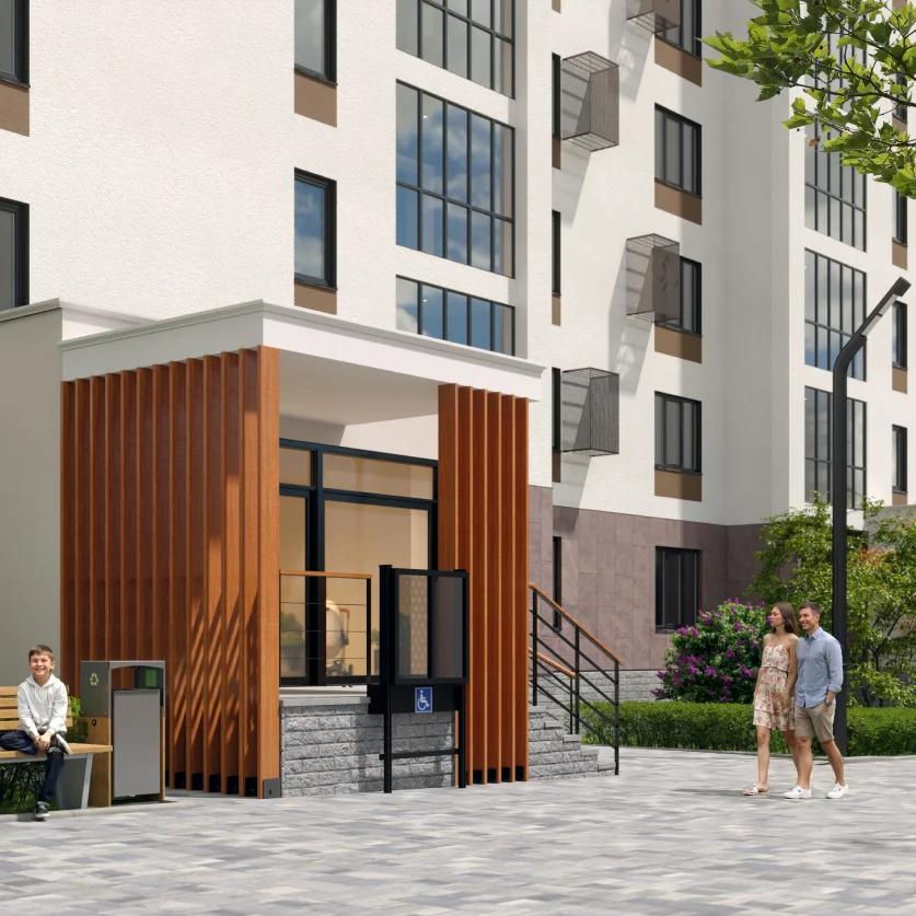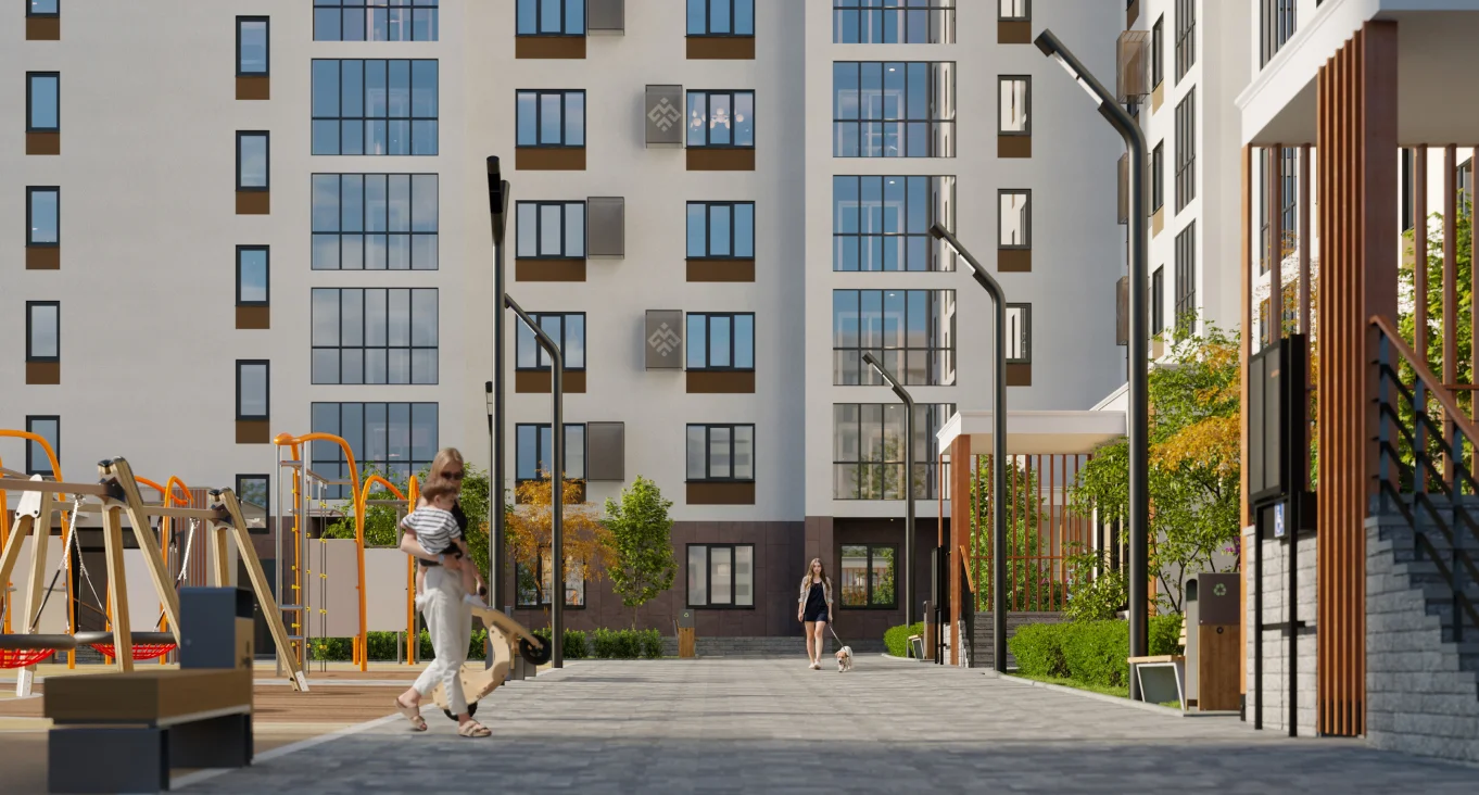 Лаконичный прямоугольный силуэт ЖК Matur органично вписывается в стиль этой оживленной части Уфы. Сдержанное экстерьерное решение придает кварталу цельность — фасады жемчужного цвета деликатно вливаются в окружающий пейзаж, подчеркивая общую атмосферу проекта: спокойной уверенности.