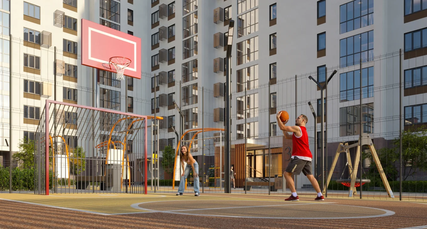 Территория комплекса позволила реализовать интересные объекты инфраструктуры—спортивные площадки «зовут задорных игроков», автовладельцы оценят удобную парковку. А словосочетание «двор без машин» не требует пояснений.